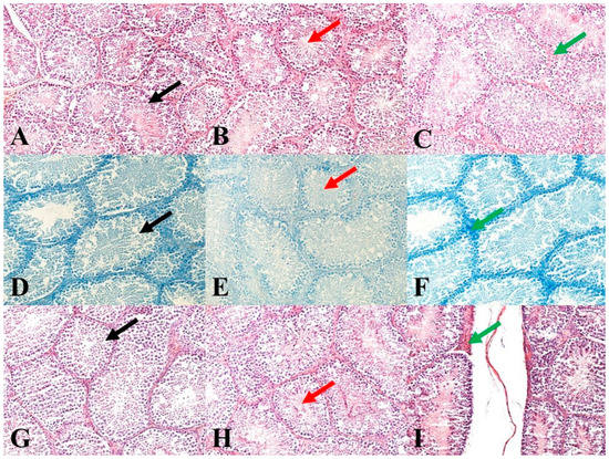 Representative images of testicular histology. (A): Control group. HE: 200×. (B): E1 group. HE: 200×. (C): E2 group. HE: 200×. (D): Control group. Toluidine Blue Polychromatic: 200×. (E): E1 group. Toluidine Blue Polychromatic: 200×. (F): E2 group. Toluidine Blue Polychromatic: 200×. (G): Control group. Sirius red: 200×. (H): E1 group. Sirius red: 200×. (I): E2 group. Sirius red: 200×. Black arrows show seminiferous tubules and germ cells in various stages of development. Red arrows show mature sperm in seminiferous tubules. Green arrows show septa between seminiferous tubules.