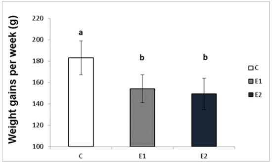 Average week weight gains (g) of male rabbits fed with green tea plant supplemented into complete feed mixture. C (without dietary green tea). E1—5 g green tea/100 kg normal food. E2—20 g green tea/100 kg normal food. Values and error bars express means ± SEM. a vs. b—difference is significant at p < 0.05.