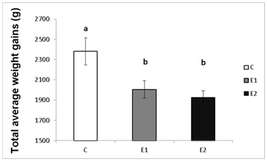 The effect of different concentrations of green tea plant powder added to the diet on the average weekly and total weight gains of the male rabbits was evaluated in our study. The highest average weight gain of rabbit males per week in the control group (C) was 183.08 ± 15.7 g, while in the experimental groups, it was 154.2 ± 12.9 g and 149.3 ± 14.6 g for the E1 and E2 groups, respectively (Figure 2). Likewise, the total average weight gain was the highest in the control group (C; 2380.3 ± 133.9 g) compared to both experimental groups (E1; 2005.67 ± 86.1 g and E2; 1925.7 ± 67.1 g; Figure 3).