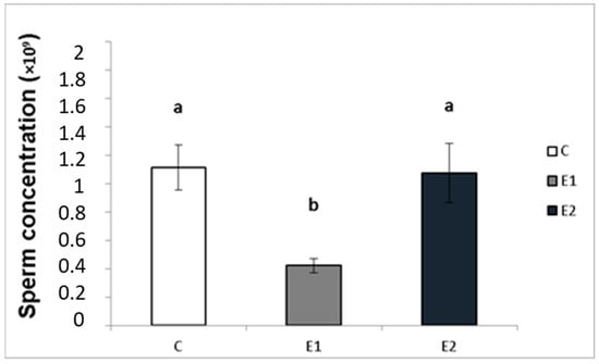 Sperm concentration in rabbits fed with green tea. C (without dietary green tea). E1—5 g green tea/100 kg normal food. E2—20 g green tea/100 kg normal food. Values and error bars express means ± SEM. a vs. b—difference is significant at p < 0.05.