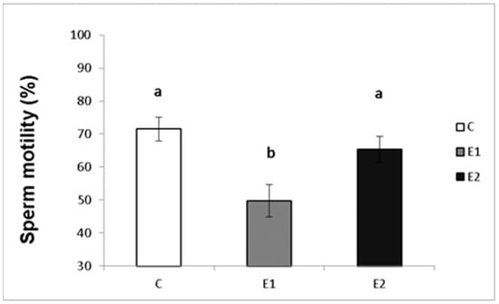 Sperm total motility in rabbits fed with green tea. C (without dietary green tea). E1—5 g green tea/100 kg normal food. E2—20 g green tea/100 kg normal food. Values and error bars express means ± SEM. a vs. b—difference is significant at p < 0.05.