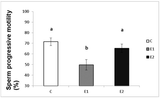 Sperm progressive motility in rabbits fed with green tea. C (without dietary green tea). E1—5 g green tea/100 kg normal food. E2—20 g green tea/100 kg normal food. Values and error bars express means ± SEM. a vs. b—difference is significant at p < 0.05.