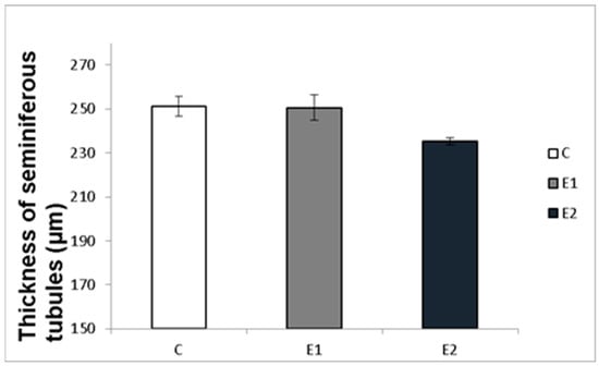 Macro- and micrometry of the testes did not uncover the impact of feeding with green tea on the seminiferous tubules or thickness of epithelia. No significant influence of green tea added at any dose on these parameters was observed, although a slight tendency to shrink the seminiferous tubules and epithelial layer in the E2 group occurred (Figure 7 and Figure 8).