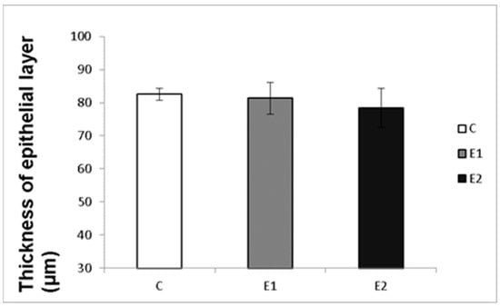 Effect of green tea on the thickness of tubular epithelial layer. C (without dietary green tea). E1—5 g green tea/100 kg normal food. E2—20 g green tea/100 kg normal food. Values and error bars express means ± SEM.