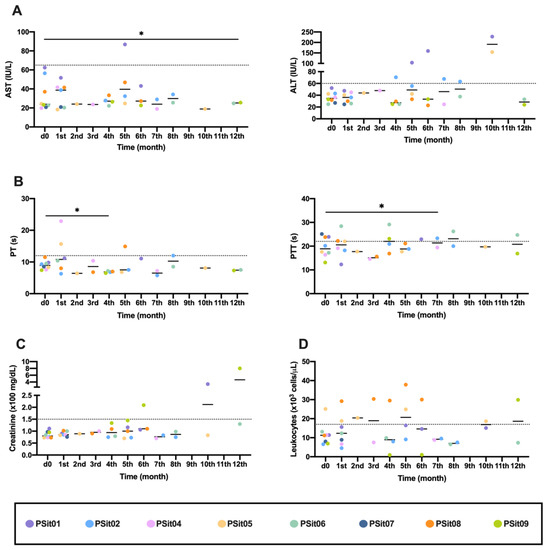 Hematological and biochemical analysis previously (d0) and during the first year of treatment. (A) Transaminases ALT and AST liver enzymes; (B) Clotting times, as PT and PTT measured in seconds (s); (C) Creatinine, renal parameters; (D) Peripheral blood leukocytes. Individual values of each patient (colored dots) and mean (-) are shown. ALT: alanine transaminase; AST: aspartate transaminase; PT: prothrombin time; PTT: partial thromboplastin time. Dashed line: limit of physiological range. The comparison group for statistical test was d0. * p < 0.05.
