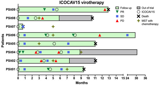 Median survival time (MST) and outcome assessment of virotherapy. The time each patient was enrolled in the study (green) or dropped out of the trial (gray), to represent overall survival, is shown. The inoculation of the virus (O) and the outcome assessment following RECIST criteria are represented only if there was a change of category reported. The baseline measurements were taken before each ICOCAV15 dose, and disease evolution was classified as partial response (PR), stable disease (SD), and progressive disease (PD). The patients’ survival time (death; X) and the MST with standard of care for each tumor type (+) are shown.