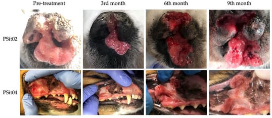 Images during follow-up from patients diagnosed with squamous cell carcinoma (SCC). SCC of patient PSit02 in the rostral region of the nasal plane and of patient PSit04 in the buccal region of the right maxillary gingiva. Photographs at medical checkup the day of the pre-treatment (d0) and several months (3rd, 6th, and 9th) after treatment are shown.