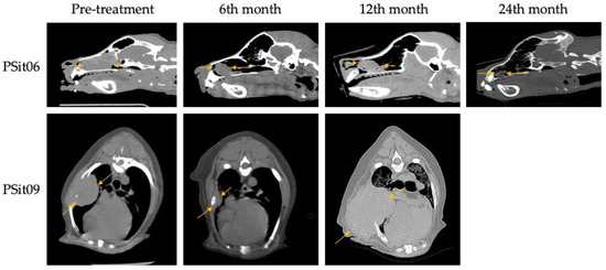 Computed tomography (CT) images during follow-up. Nasal adenocarcinoma of patient PSit06 in the nasal cavity and squamous cell carcinoma metastasis in the costal region of patient PSit09 are indicated by arrows. Sagittal slice CT images for patient PSit06 and cross-sectional images for patient PSit09 taken at their largest diameter on the initial day of treatment (d0), at six months (6th), at 12 months (12th), and at 24 months (24th) are shown.