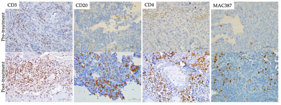 Tumor Infiltrated immune cells. (brown) on formalin-fixed paraffin-embedded (FFPE) pre-(top) and post-treatment (bottom) biopsies including hematoxylin counterstaining (blue). T lymphocytes (CD3) of PSit02 at d0 and d332, T helper lymphocytes (CD4) of PSit06 at d0 and d126, B lymphocytes (CD20) of PSit02 at d0 and d332, and monocytes/macrophages (MAC387) in PSit06 at d0 and d28 are shown. Scale bar: 50 µm.