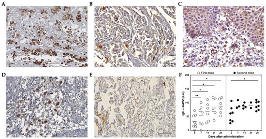 ICOCAV15 and antiviral response during follow-up. (A–E) Representative images of tissues showing adenovirus-positive cells (brown) assessed by immunohistochemistry. Scale bar: 50 µm. (A) PSit05 with pulmonary carcinoma 5.8 months after the last OV dose. (B) PSit07 with squamous cell carcinoma (SCC) 21 days after the last ICOCAV15 dose. (C) Distant metastasis of PSit09 (SCC rib wall) with ICOCAV15 (D) Spleen necropsies of PSit05 (pulmonary carcinoma). (E) Hepatic tissues of PSit07 (SCC nasal plate). (F) IgG α-CAV2 quantified by solid-phase ELISA in peripheral blood is shown. Arbitrary units (a.u.) from each patient (○ and ●) and mean (-) showing anti-adenoviral immunoglobulins present in the serum of canine patients during ICOCAV15 treatment. The comparison group for statistical test was d0. * p < 0.05, ** p < 0.01.