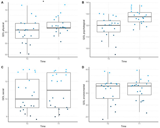 Distribution of the QOL score for each domain, divided by responding time (T0 vs. T1). The middle line in the box plots represents the median score, the extremes of the boxes represent the lower and upper quartiles, and the error bars represent the minimum and the maximum scores; * = p < 0.001. (A) Scores for the physical domain of QOL; (B) scores for the psychological domain of QOL; (C) scores for the social domain of QOL; (D) scores for the environmental domain of QOL.