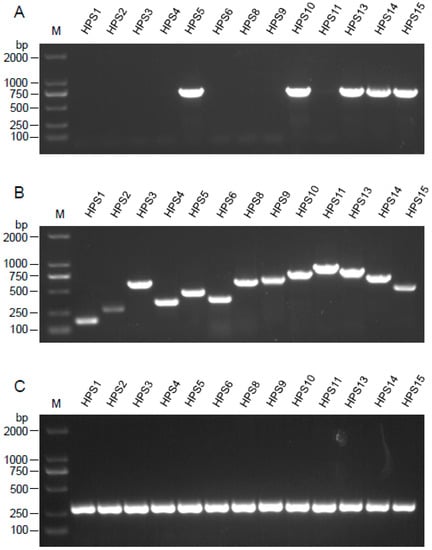 The 13 G. parasuis reference strains for this study were obtained from the China Institute of Veterinary Drug Control []. They were representative of 13 different serovars: serovar 1 (as Glaesserella parasuis is formerly known as Haemophilus parasuis, in this study, Glaesserella parasuis serovar 1, simply named HPS1), serovar 2 (HPS2), serovar 3 (HPS3), serovar 4 (HPS4), serovar 5 (HPS5), serovar 6 (HPS6), serovar 8 (HPS8), serovar 9 (HPS9), serovar 10 (HPS10), serovar 11 (HPS11), serovar 13 (HPS13), serovar 14 (HPS14), and serovar 15 (HPS15). All of these strains were grown as described above and harvested for genomic DNA extraction with the TIANamp Bacteria DNA Kit (Tiangen Biotech Co., Ltd., Beijing, China). All 13 serovars were confirmed with a previously reported PCR method [].