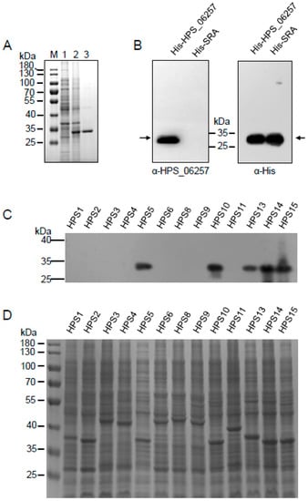 Although we showed that the HPS_06257 gene occurs in only some strains of G. parasuis, it was unclear whether it was expressed in those strains. Therefore, we developed a polyclonal antibody against the recombinant HPS_06257 protein to detect the expression of native HPS_06257 in those strains. Purified recombinant HPS_06257 expressed in E. coli (Figure 2A) was used to immunize mice and generate a polyclonal antibody. To examine the specificity of this antibody, we first investigated its reaction with recombinant HPS_06257 and reported His-SRA [] with Western blotting. The polyclonal antibody specifically reacted with recombinant HPS_06257 but not with recombinant SRA (Figure 2B). In contrast, an anti-His antibody detected both of these recombinant (His-conjugated) proteins. Thus, we confirmed the successful generation of a polyclonal antibody against the HPS_06257 protein.