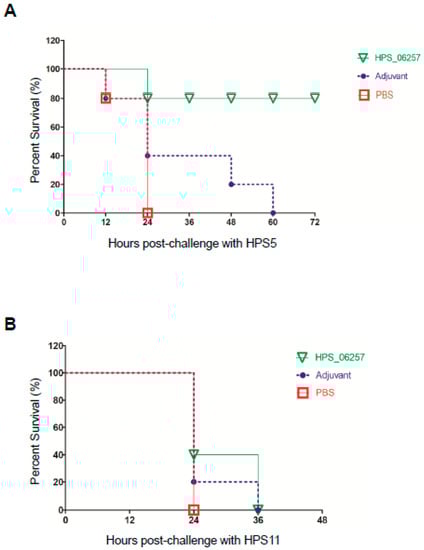 Because HPS_06257 is an important protective antigen against G. parasuis infection, we investigated the immunoprotective effects of HPS_06257 against HPS_06257-expressing strains and HPS_06257-null strains. We examined the immunoprotective role of HPS_06257 against HPS5 (an HPS_06257-expressing strain) and HPS11 (an HPS_06257-null strain) infections. Fourteen days after the booster immunization, each group was challenged with five median lethal doses of HPS5 or HPS11. The mice immunized with HPS_06257 showed 80% survival within 72 h of challenge with HPS5, whereas the mice treated with PBS or adjuvant all died within 60 h of challenge with HPS5 (Figure 3A). All the mice challenged with HPS11 died within 36 h of challenge (Figure 3B). These results indicate that HPS_06257 is protective against infection with HPS5 (an HPS_06257-expressing strain) and not against HPS11 (an HPS_06257-null strain).