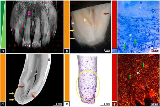 Category 3, tooth 101, 22-year-old mare. (a) Intraoral radiograph showing tooth 101 with a slightly blunted root tip (pink arrow). (b) Stereomicroscopic image. Although the exact border between cementum (C) and dentine (D) is not visible most peripheral areas of the dental hard substances are defined as cementum and areas near the pulp (P) are defined as dentine. The red arrow indicates a suspected resorption filled with reparative cementum. The yellow arrows display the enlarged root. (c) Histological image, toluidine blue stain. Masses of reparative cementum (rC) cause a hypercementotic enlargement. The reparative cementum features wavy incremental lines and large vascular channels (green arrows). C = cementum. (d) Cross-sectional µCT image. Although the exact border between cementum (C) and dentine (D) is not visible most peripheral areas of the dental hard substances are defined as cementum and areas near the pulp (P) are defined as dentine. The red arrows indicate suspected resorptions filled with reparative cementum. The yellow arrows display the bulbous enlargement of the root tip. E = Enamel. (e) Mesh reconstruction of µCT image with visualized surface curvature. The dental surface appears irregular and especially within the yellow ellipse spherical irregularities can be observed. White areas = smooth surface, red color = invaginations of the surface and blue color = protrusions of the surface. (f) Histological image, picrosirius red stain. Reparative cementum (rC) features an irregular arrangement of collagen fibers and numerous vascular channels (green arrows).