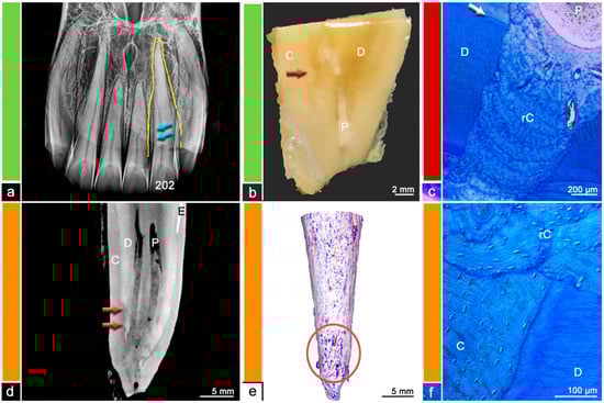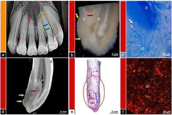 Category 4, tooth 202, 19-year-old mare. (a) Intraoral radiograph. The yellow line indicates an enlargement of the intra-alveolar part of the tooth. Blue arrows indicate mild surface irregularities. (b) Stereomicroscopic image. Although the exact border between cementum (C) and dentine (D) is not visible most peripheral areas of the dental hard substances are defined as cementum and areas near the pulp (P) are defined as dentine. The red arrow indicates a suspected resorption filled with reparative cementum. (c) Histological image, toluidine blue stain. Reparative cementum (rC) extends into the pulp cavity (P). The white arrow indicates the regular dentino-cemental junction. D = dentine, C = cementum. (d) Cross-sectional µCT image. Although the exact border between cementum (C) and dentine (D) is not visible most peripheral areas of the dental hard substances are defined as cementum and areas near the pulp (P) are defined as dentine. The red arrows indicate suspected resorptions filled with reparative cementum. E = Enamel. (e) Mesh reconstruction of µCT image with visualized surface curvature. The dental surface appears irregular and especially within the red ellipse a streaky distribution of irregularities can be observed. White areas = smooth surface, red color = invaginations of the surface and blue color = protrusions of the surface. (f) Histological image, toluidine blue stain. Masses of reparative cementum (rC) feature an irregular arrangement of incremental lines and an irregular distribution of cementoblasts. D = dentine, C = cementum.