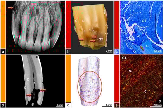 Category 5, tooth 103, 27-year-old mare, resorptive type of EOTRH. (a) Intraoral radiograph. The tooth 103 displays a large apical resorption (red arrow). (b) Stereomicroscopic image. Although the exact border between cementum (C) and dentine (D) is not visible most peripheral areas of the dental hard substances are defined as cementum and areas near the pulp (P) are defined as dentine. The red arrows indicate a suspected resorption filled with granulation tissue (GT). (c) Histological image, toluidine blue stain. Dentine (D), cementum (C), reparative cementum (rC) and a mass of granulation tissue (GT) can be observed. The red arrow indicates a resorptive lesion filled with reparative cementum (rC). (d) Cross-sectional µCT image. Although the exact border between cementum (C) and dentine (D) is not visible most peripheral areas of the dental hard substances are defined as cementum and areas near the pulp (P) are defined as dentine. The red arrows indicate resorptive areas. E = Enamel. (e) Mesh reconstruction of µCT image with visualized surface curvature. The dental surface appears irregular and especially within the red ellipse spherical irregularities can be observed. White areas = smooth surface, red color = invaginations of the surface and blue color = protrusions of the surface. (f) Histological image, picrosirius red stain. Reparative cementum (rC) with its irregular arrangement of collagen fibers compared to regular cementum (C) can be observed. D = dentine, GT = granulation tissue.