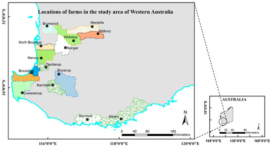 The study was conducted in the south-west region of Western Australia (Figure 1). The region has a temperate Mediterranean climate with an annual rainfall of approximately 730 mm. Dairy farms are predominantly located southwest of Perth (capital city of Western Australia), being well-suited to pasture-based feeding systems.