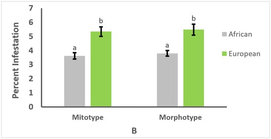 Percentage (±SE) of comb cells containing honey bee brood (A) or adult bees (B) of African or European mitotype or morphotype that were infested with Varroa destructor in 339 colonies. Different letters (a, b) above bars indicate significant differences between means, based on Wilcoxon tests.