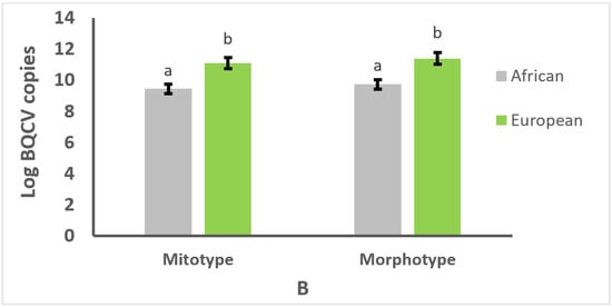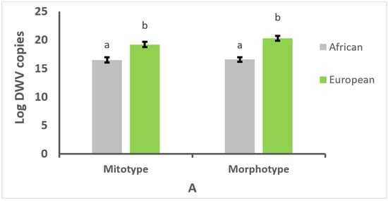Mean number copies of deformed wing virus (DWV) (A) or black queen cell virus (BQCV) (B)/µg of RNA × 106 ± SE in worker honey bees of African and European mitotype and morphotype from 76 colonies. Different letters (a, b) above the bars indicate significant differences between mitotypes and morphotypes based on Student t tests performed with natural logarithm-transformed data.