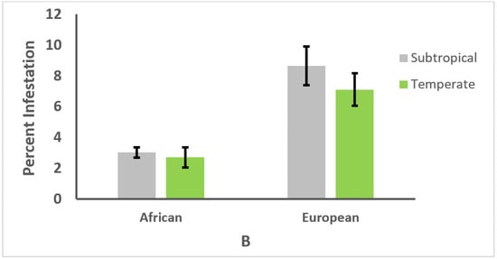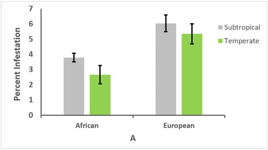 Percentage (± SE) of comb cells containing honey bee brood (A) or adult bees (B) of African or European genotype (with the same morphotype and mitotype, respectively) that were infested with Varroa destructor in 273 colonies located in subtropical and temperate climates.