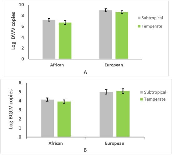 Mean number copies of deformed wing virus (DWV) (A) or black queen cell virus (BQCV) (B)/µg of RNA × 106 ± SE in worker honey bees of African and European genotype (with the same morphotype and mitotype, respectively) from 59 colonies located in subtropical and temperate climates. Data transformed to natural logarithm are shown.