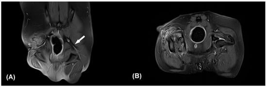 Contrast enhanced fat-suppressed proton density weight images (CE-FS-PDWI) of dorsal (A) and transverse plane (B). The white arrow indicates the intact left sciatic nerve (A). The right sciatic nerve strand is not clearly identifiable (A,B). Note that focal discontinuity of the sciatic nerve, muscle fibrosis, and edema of surrounding soft tissue. Q: quadriceps muscle, Bi: biceps femoris muscle.