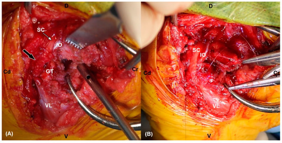 (A) The intraoperative photograph shows fibrotic (black arrow) and indistinguishable lesions of the right sciatic nerve. Note the intact proximal ending of sciatic nerve (white arrow). (B) Neurorrhaphy was performed by using multiple epineural sutures after debridement of the damaged nerve. SC: sciatic nerve, IO: internal obturator muscle, VL: vastus lateralis muscle, GT: greater trochanter, Cr: cranial, Cd: caudal, D: dorsal, V: ventral.