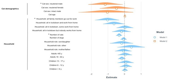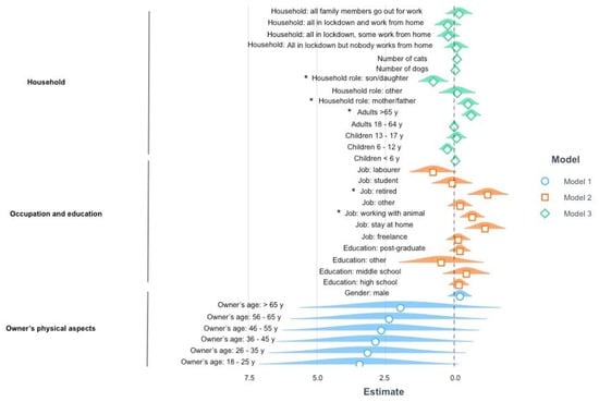 We then calculated a series of ordinal regressions for each domain of the modified C/DORS and the behaviour problems “aggression towards familiar people” and “aggression towards familiar cats”. Each regression was calculated with fixed factors, without interactions: (1) a model of owner’s demographics included the age and gender of the owner; (2) a model of owner’s employment included job type and education; (3) a model of housing included the type of home, outdoor access, size, satisfaction in the size and in the access to outdoor and (for the behaviour problems) access to outdoor for the cat; (4) a model of finance included the family income; (5) a model of lockdown duration included the lockdown duration and the respondent’s expectations regarding the lockdown duration; (6) a model of lockdown consequences included financial consequences, emotional aspects, physical health and changes in lifestyle; (7) a model of the household included the number of underage family members (grouped as <6 years, 6–12 years, 13–17 years), the number of adults (grouped as 18–64 years, >64 years), the role of the respondent in the family, number of dogs, number of cats and characteristics of the family members; (8) a model of the demographics of the cat included age and sex; (9) a model of the relationship changes included changes in the QoL of the cat during the lockdown, comfort of the cat during the lockdown and whether the owner felt angry with the cat.
