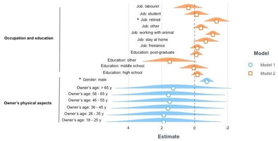 The variance in the perceived emotional closeness dimension (Figure 2) was explained by models built on owners’ education and occupation (7.4%) (Model Fit: Nagelkerke Rp2 = 0.074, p = 0.000013), and owners’ physical features (3.4%) (Model Fit: Nagelkerke Rp2 = 0.034, p = 0.0075). As for the first model, owners who worked as employees (β = −1.108, p = 0.0001), those who worked as freelancers (β = −0.944, p = 0.003) and those who worked as labourers (β = 1.491, p = 0.031) were more likely to have improved their emotional bond with their cats compared to owners who worked with animals. With regard to the second model, female owners were more likely to have improved the bond with their cat compared to male owners (β = −0.734, p = 0.0007).
