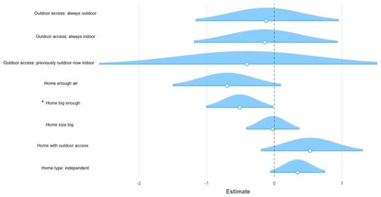 As for the variable “aggression towards other household cats” (Figure 4), 2.6% of the variance was explained by the model including house-related predictors (Model Fit: Nagelkerke Rp2 = 0.026, p = 0.032). Specifically, owners who perceived their house to be too small for all household members were more likely to report increased “aggression towards other household cats” during the lockdown, compared to owners who perceived their house to be big enough (β = 0.514, p = 0.041). No other significant effect of the models tested was found for any other problematic behaviour.