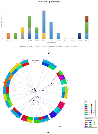 Transmission analysis of the t2873 strain within farm ‘A’. (a) Epidemic curve of S. aureus infection cases, September 2019–August 2020. (b) Phylogenetic analysis of 25 S. aureus t2873 isolates. Metadata layers include isolation month and milking group.