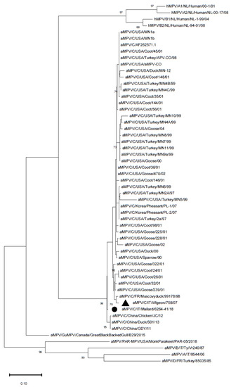 Phylogenetic tree reconstructed using the M gene of aMPV strains from Supplementary Table S1. The Italian mallard strain is marked with a black circle, whereas the previously detected Italian strain is marked with a black triangle. The tree was reconstructed using the Maximum Likelihood method and Tamura 3-parameter model with discrete Gamma distribution. Bootstrap support (>70%) is shown next to the branches. The tree is drawn to scale, with branch lengths measured in the number of substitutions per site. This analysis involved 56 nucleotide sequences. All of the positions containing gaps and missing data were eliminated. The final dataset was composed of 358 positions.