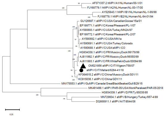 - Graziosi, G.; Mescolini, G.; Silveira, F.; Lupini, C.; Tucciarone, C.M.; Franzo, G.; Cecchinato, M.; Legnardi, M.; Gobbo, F.; Terregino, C.; et al. First detection of avian metapneumovirus subtype C Eurasian lineage in a Eurasian wigeon (Mareca penelope) wintering in Northeastern Italy: An additional hint on the role of migrating birds in the viral epidemiology. Avian Pathol. 2022, 51, 1–8. [Google Scholar] [CrossRef] [PubMed]