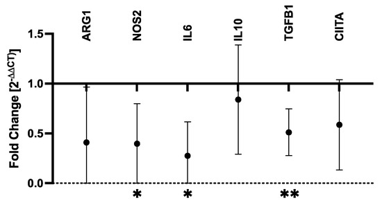 RNA was converted into cDNA using the qScript cDNA Synthesis Kit (95047-100, Quanta BioSciences, Gaithersburg, MD, USA), according to the manufacturer’s protocol. Total RNA (1 μg), qScript reagent (4 μL), and RT (1 μL) were aliquoted into 0.2 mL sterile PCR reaction tubes. The total reaction volume was up to 20 μL with nuclease-free water. The cDNA reaction tubes were incubated for 5 min at 25 °C, 30 min at 42 °C, 5 min at 85 °C, and then held at 4 °C in the thermal cycler. RT-qPCR reactions were prepared according to the manufacturer’s protocol using PerfeCTa SYBR Green FastMix ROX (95073-012, Quanta BioSciences, Gaithersburg, MD, USA). Primer pairs targeting ARG1 (arginase), NOS2 (iNOS), IL6 (IL-6), IL10 (IL-10), TGFB1 (TGF-β1), and class II major histocompatibility complex transactivator (CIITA) are listed in Supplementary Table S3. CIITA was included as a marker of MHCII expression [21]. The reactions were conducted in a 384-well plate with a total volume of 10 μL in each well, consisting of 2 uL of cDNA, 0.4 μL of forward and reverse primers, 5 μL of PerfeCTa SYBR Green FastMix, and 2.2 μL of nuclease-free water.