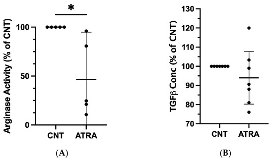 Evaluation of protein expression in ATRA-treated canine MDMs, as compared to control MDMs. Canine PBMCs were differentiated into MDMs in the presence of rhM-CSF (25 ng/mL), and ATRA (2 μM) or vehicle control media for 5 days. An equal number of ATRA-treated and control MDMs from each dog were input into each assay. (A) Arginase activity of control and ATRA-treated MDM lysates. n = 5. (B) TGF-β1 concentration in supernatant of control and ATRA-exposed MDMs after 24 h incubation. n = 7. Results are displayed as a percentage of paired control MDM values. The mean and 95% CI are shown, and individual data points are plotted. * p < 0.05.