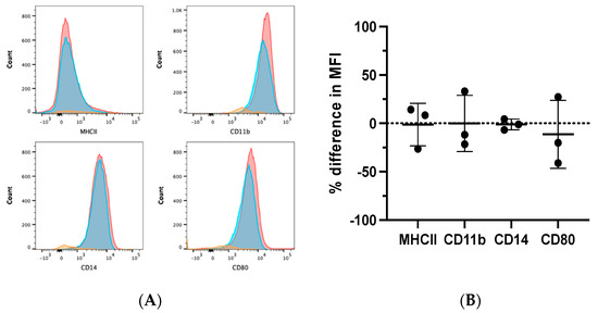 Flow cytometry was performed on ATRA-treated and control MDMs from three dogs to evaluate the differential expression of phenotypic markers of monocytes/macrophages, such as CD11b, CD14, MHCII, and CD80 [7,11,29]. MDMs were determined to be positive for CD11b, CD80, and CD14 expression, and negative for MHCII expression. ATRA treatment during MDM differentiation did not alter this pattern of expression (Figure 3A,B).