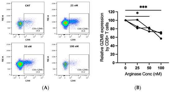 Granzyme B (GZMB) expression in canine CD8+ T-lymphocytes exposed to arginase. PBMCs from three dogs were incubated in complete media, with or without indicated concentrations of arginase (25–100 nM), for two days prior to flow cytometry analysis. CD8+ T-lymphocytes were analyzed after first gating on the lymphocyte cloud, single cells, live cells, CD3+, and CD4−CD8+ cells (Supplementary Figure S1B). Representative scatter plots (A) and summary graph (B) show the proportion of GZMB+ CD8+ T-lymphocytes with increasing concentrations of arginase. Lines connect data points from each individual dog. * p < 0.05; *** p < 0.001; n = 3.