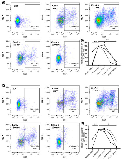 Canine PBMCs were treated with ConA (5 μg/mL) and arginase at the indicated concentrations for two days prior to the evaluation of Ki67 expression with flow cytometry. We observed a significant decrease in Ki67 expression with increasing concentrations of arginase for CD4+ and CD8+ T-lymphocytes. Proliferation was significantly decreased at arginase concentrations of 50 nM (mean difference = −56%, p = 0.036) and 100 nM (mean difference = −90%, p = 0.002) in CD4+ T-cells (Figure 5A,B), and at an arginase concentration of 100 nM (mean difference = −81%, p = 0.002) in CD8+ T-cells (Figure 5C,D). Arginase did not induce consistent changes in CD25 expression on mitogen-stimulated lymphocytes (data not shown).