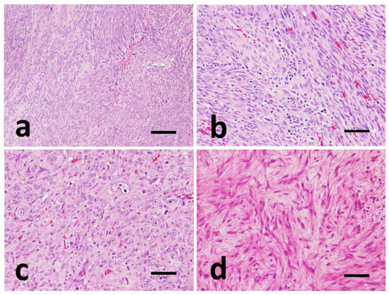 The classification was based on histopathological observations according to the criteria established by the WHO specific for the tumors of gastrointestinal tract [3], and on the basis of the veterinary literature [5,6,7,8,9,10,12,13,14,15,16]. During the histological evaluations, the morphological type of each case was identified, and they were classified according to their histological pattern (storiform, epithelioid, myxoid and fascicular). Malignant tumors were classified using criteria based on cell differentiation, presence and extension of necrosis within the neoplastic mass, and mitotic index [27,28]. For the evaluation of the histological grade, the samples were scored from 1 to 3 for each of the three previous parameters: overall cell differentiation (1, neoplasms that show close resemblance to the physiological tissue of the adult animal and do not show cellular atypia; 2, neoplasms showing a defined histological subtype or moderate atypia; 3, neoplasms with poor differentiation and marked atypia); mitotic activity (1, range from 0 to 9 of mitotic figures for ten fields at high magnification; 2, range from 10 to 19 of mitotic figures for ten fields at high magnification; 3, 20 or more mitotic figures for ten fields at high magnification) and necrosis (1, absence of necrosis; 2, necrosis ≤ 50% of the tumor surface of the histological section; 3, necrosis > 50% of the tumor surface of the histological section). Grade I was assigned to a final score of 3 or 4; Grade II was assigned a score of 5 or 6 and Grade III was assigned with a score of 7, 8 or 9.
