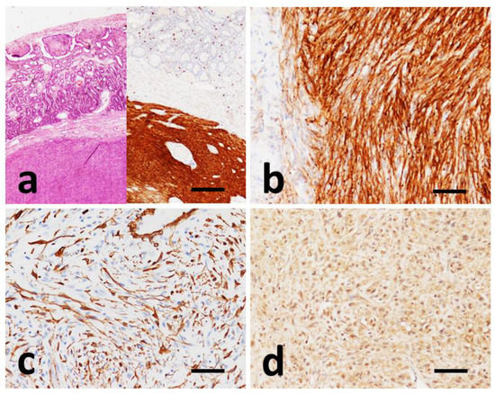 The results were graded as follows: −, negative reaction; +, foci of positivity (<50% of neoplastic cells show a positive reaction); ++, widespread cellular positivity (>50% and <75% of cells immunoreactive); +++, most (>75%) of neoplastic cells are positive. Appropriate positive controls were used in order to evaluate the specificity of the reactions and ascertain the appropriate cross-reactivity in the dog tissue. Normal skeletal muscle and normal dog intestine were used as positive controls for mesenchymal markers (SMA, Desmin and PDGFRα). Purkinje cells from cerebellar tissue and mast cell tumors were used as a positive control for CD117 [29,30]. As a negative control for the immunohistochemical procedure, 10% normal goat serum was used on the replicated sections instead of the primary antibody.