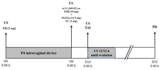 Hormonal protocol scheme used in the study. eCG = equine chorionic gonadotropin; FSH = follicle stimulating hormone; EB = estradiol benzoate; PGF2α = prostaglandin; EC = estradiol cypionate; TAI = fixed-time artificial insemination; PD = pregnancy diagnosis; US = ultrasound evaluation (performed only in Experiment I).