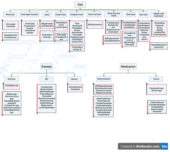 There are numerous factors that can cause alterations in canine gut microbiota (Figure 1). Such factors include diet [], diseases [], and medical interventions [,,,].