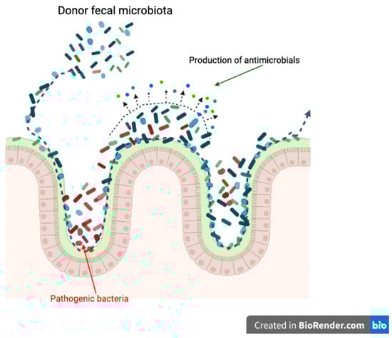Potential mechanism of FMT; production of antimicrobials. (Created with BioRender.com, accessed date 18 June 2022).