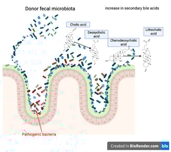 Potential mechanism of FMT; increased production of secondary bile acids. (Created with BioRender.com, accessed date 18 June 2022).