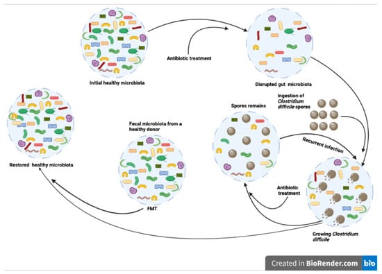 Possible mechanism of FMT therapy for Clostridium difficile infection. (Created with BioRender.com, accessed date 18 June 2022).