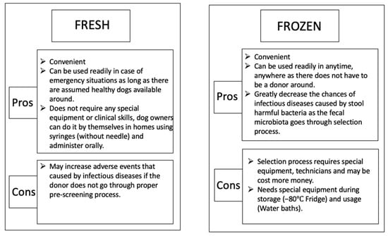 Stool storage is also an important step in FMT. In dogs, currently, in most cases, freshly collected feces are used for FMT treatments. In human studies, it was found that frozen stool samples are just as effective as fresh fecal material []. This result has more significant meaning for veterinary clinics as using prescreened fecal materials in storage is a cost- and time-effective and much safer approach compared to fresh FMT. Frozen stool can overcome the geographic limitation and facilitate increased implementation of FMT in canine clinical practices (Figure 7).