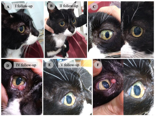 Evolution of clinical signs in a leishmaniotic cat treated with allopurinol 10 mg/kg PO q 12 h. (A) First follow-up and (B) two-months follow-up. (C) Comparison of the same periocular region before and after the treatment. (D) First relapse at the IV follow-up, (E) the improvement of the lesion after treatment, (F) and the resolution of the ocular granuloma after the treatment with allopurinol.