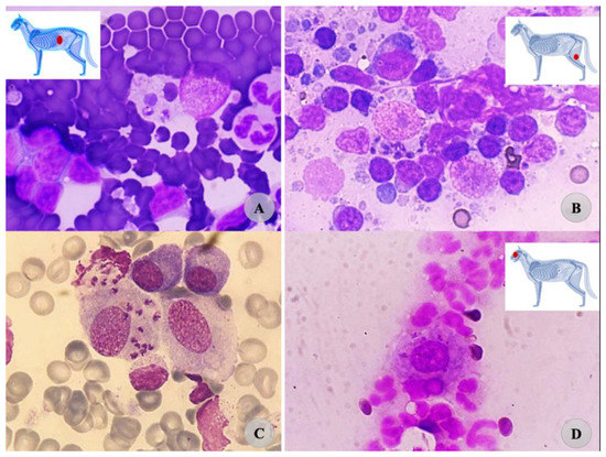 In November 2019, the cat was referred again due to the worsening of clinical conditions. On that occasion, the cat showed a significant weight loss (i.e., 3.5 kg), sensory depletion, exfoliative dermatitis, and alopecic areas on the eyelids (Figure 2A); moreover, the enlargement of palpable lymph nodes and splenomegaly were observed. Increases of White Blood Cells (WBC) with lymphocytosis, anaemia, and thrombocytopenia were also present (Table 1). Therefore, considering the enlargement of the spleen combined with moderate leucocytosis, ultrasound-guided splenic biopsies and FNA of the popliteal lymph node were performed. The obtained smears showed the presence of several histocytes engulfed by L. infantum amastigotes (Figure 2C,D and Figure 3A,B, respectively). The serology for L. infantum through IFAT was positive with a titre of 1:1280 (Table 3), and allopurinol (Allopurionolo, Teva, Assago, Italy) at a dose rate of 10 mg/kg PO q 12 h was prescribed.