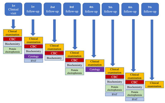 The patient was a thirteen-year-old European Shorthair (ESH), neutered male with a 4 kg body weight, living in Catania province (Sicily, southern Italy), an area considered endemic for canine leishmaniosis [31], and it was referred, in May 2019, due to several episodes of vomiting. In the first visit, the patient underwent a standard physical examination and a complete cells blood count using an automated haematology analyser (HeCo Vet C, SEAC, Florence, Italy). Serum proteins (i.e., albumin, globulins), creatinine, and alanine amino-transferase (ALT) were also estimated using an automated UV spectrophotometer (Slim, SEAC, Florence, Italy). Particularly, seven follow-up visits for monitoring the health condition of the animal and treatment response were performed. In the Scheme 1, the analyses conducted in each of the follow-up visits are reported.
